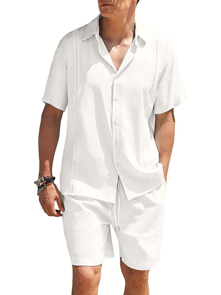 2 Pieces Sets: This beach guayabera shirt design by spread collar, short sleeves, buttoned placket, vertical pleats, straight hem. The linen beach shorts with stretchy waist and adjustable drawstring, double-sided slant pockets for easy storage of small items.