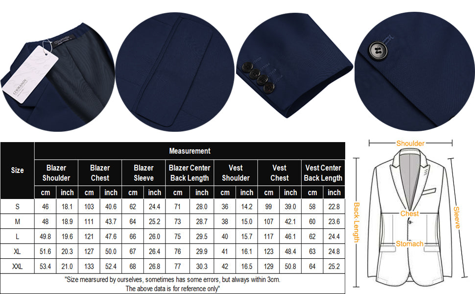 DESIGN: Package includes 1*Blazer Jacket and 1*Vest. The blazer has four-button cuffs, flap pockets, interior pockets, fully lined, featuring notched lapels and two button closure; And the vest features adjustable back belt and side pockets.