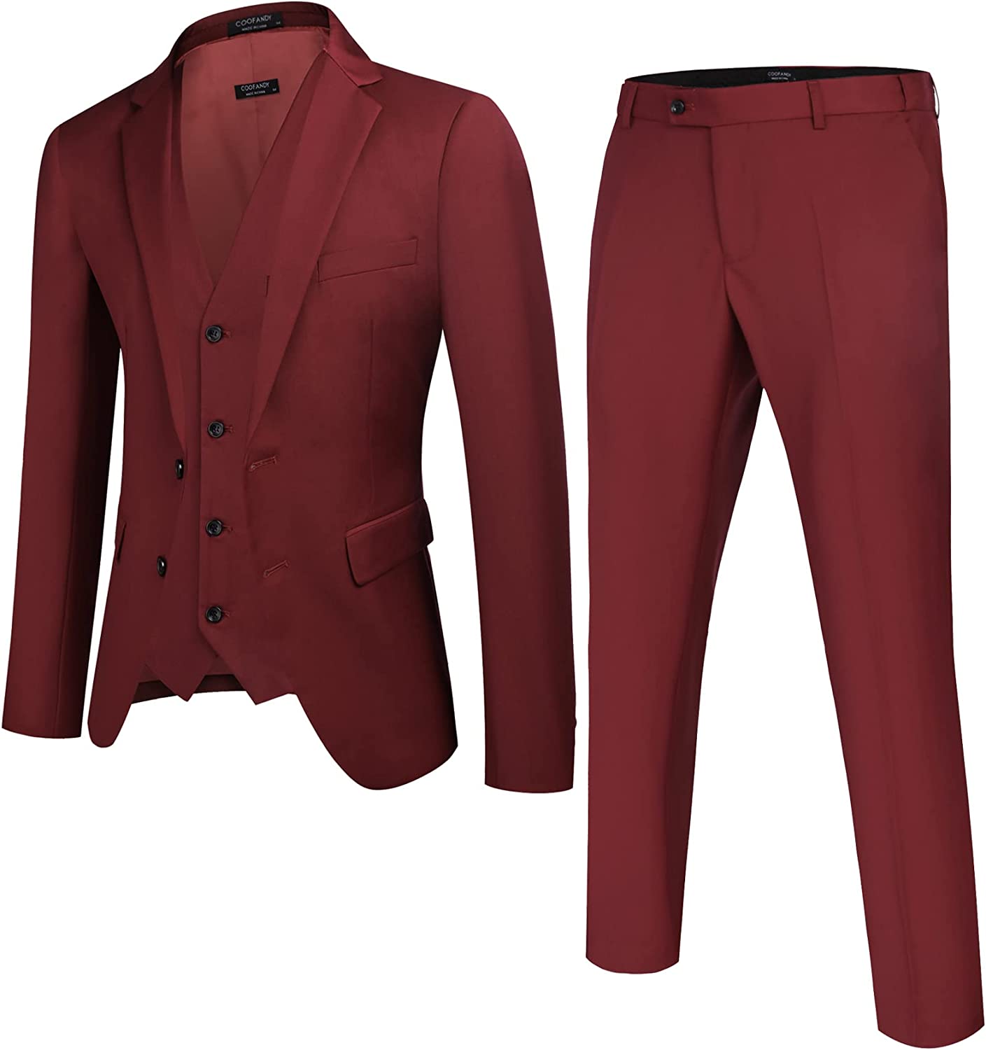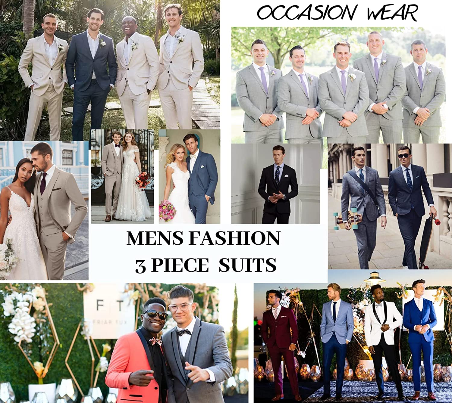 • Classic Suit Set - Blazer: Two Button Suit Jacket with notched lapels and slim-fitting cut, 3 cufflinks, 2 flap pockets; Pants: Flat-toe free-length trousers with loose style; Vest: 4 button, V-neck, smooth back and adjustable back tie.