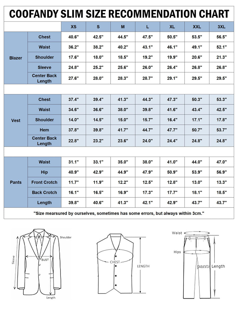 • Choose Your Size - The Dress Pant of the 3 piece suits is a little bit loose, If you prefer a slim fit style,please choose one size down! Do not look at the Amazon size chart, strongly recommended to refer to our SIZE CHART in product images to ensure accurate fitting.