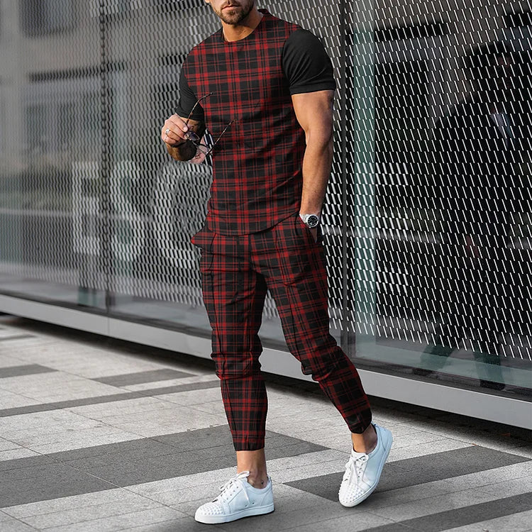 Fashion Men's Plaid Casual Short Sleeve T-Shirt And Pants Co-Ord