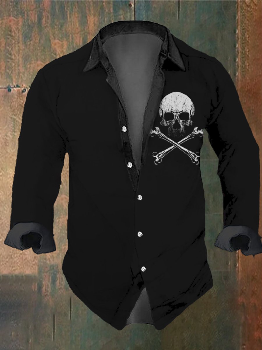 Men's Vintage Cross Skull Print Long Sleeve Shirt