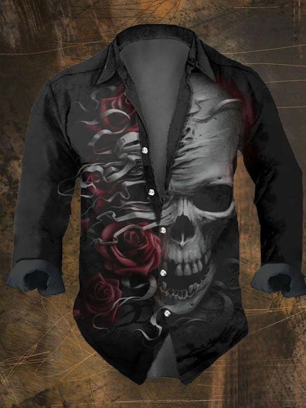 Men's Vintage Dark Skull Print Long Sleeve Shirt