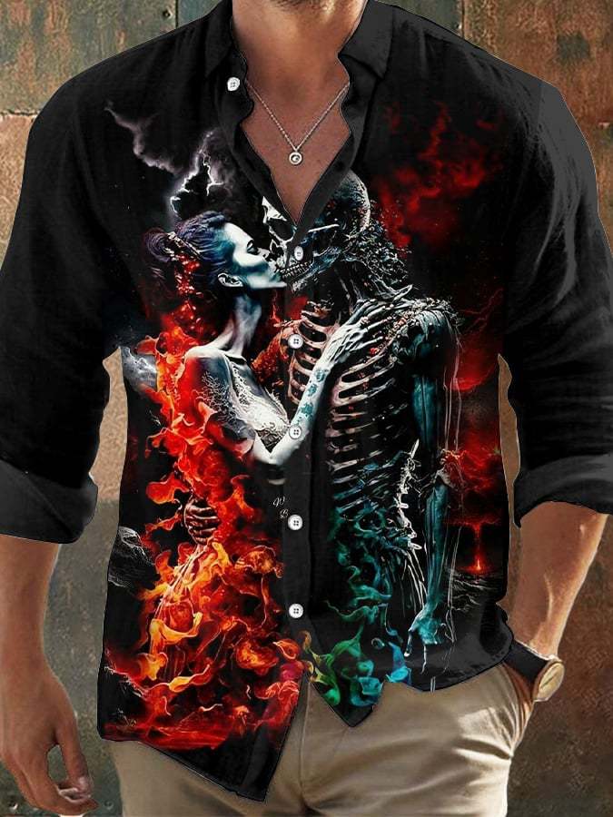 Men's Vintage Skull Print Lapel Long Sleeve Shirt